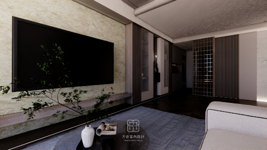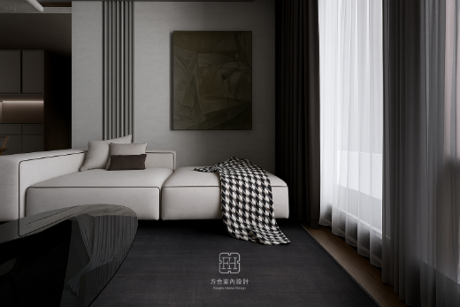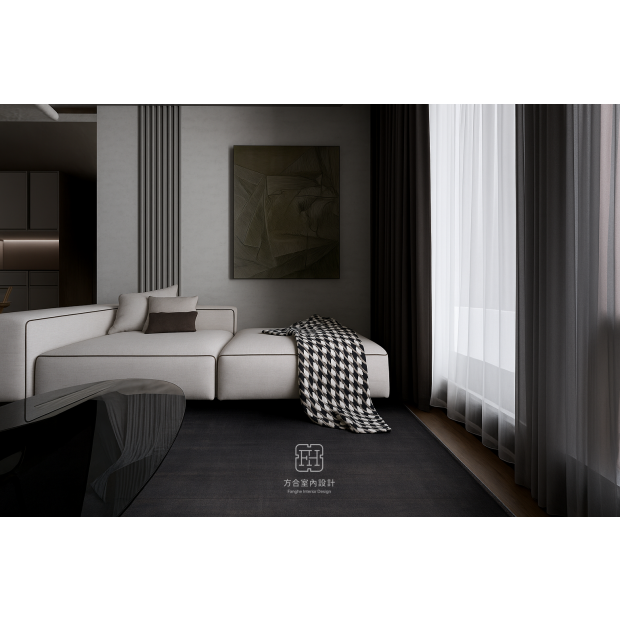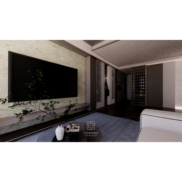業主希望兼具大容量收納與流暢動線,並同時保留採光不讓裝修而影響自然採光,且在有限空間中劃出多功能工作區及泡茶會客空間。本案以「極簡留白×自然質樸」為設計核心,揉合北歐風的溫潤木質語彙,進門後映入眼簾的是採用細膩磨石漆與隱藏式置物櫃的電視牆,既能完美隱藏雜物,也讓灰白基調下的空間更顯潔淨與層次。格柵屏風巧妙劃分公私領域,既保留通透感,又在視線流動中自然引導動線;對側落地窗鋪上淺色紗簾,既確保隱私又讓自然光輕柔灑入,整日光影變化成了最好的氛圍師。