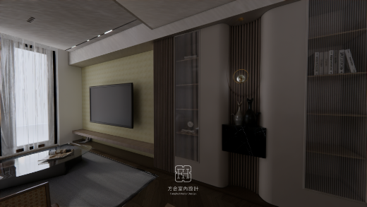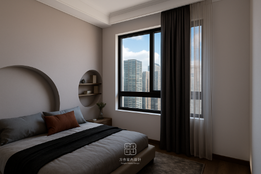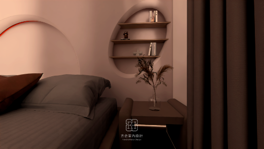 舒適睡眠場域:主臥以圓弧嵌入式展示格與暖灰塗料,營造溫馨包覆感。