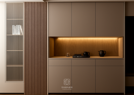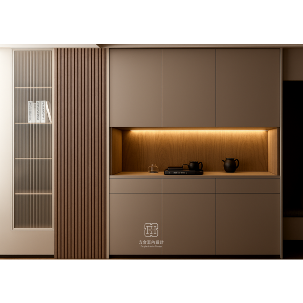 走廊一側的隱藏壁櫃內藏暖黃燈帶,不只提供大容量收納,更將過道變成溫馨的光影廊道;近門之處則設置隱藏插座與托盤,為工作區提供了靜謐而實用的閱讀與辦公環境。主臥延續客廳的淺灰與木質語彙,以圓弧展示格與深色窗簾交織出溫馨包覆感,讓人一躺下就能卸下疲憊、享受深沉好眠。從選材到配色、從機能到氛圍,每一處細節都在「乾淨、耐看、能久住」的理念下,編織出輕柔自在的北歐日常。